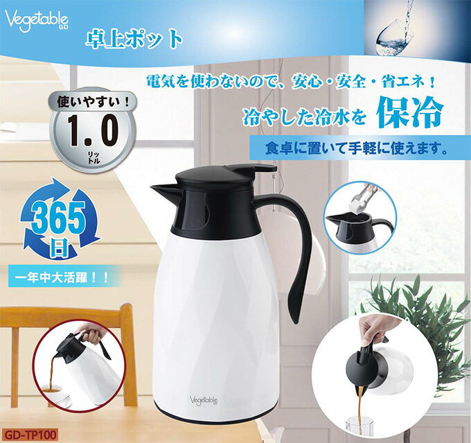 卓上ポット 魔法瓶 保温 保冷 1L ガラス GD-TP100 保温ポット 1リットル 電気不要 軽量 温かい 冷たい お茶 冷水 コーヒー 紅茶 おしゃれ ピッチャー まほうびん キッチン 一人暮らし