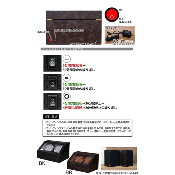 時計収納 ワインディングマシーン 4本巻です自動巻時計専用の電動振動装置です4本の時計を同時に巻き上げます別途6本の時計を収納可能です本体表面は柔らかな質感のPUレザーです3通りの回転方法から設定が出来ます本体背面のスイッチで設定を行って下さい【ご注意】ワインディングのモード切替は電源がOFFの状態で行って下さいワインディングマシンの動作中に時計を差し込んだり取り外したりしないで下さい故障の原因となりますモーターには品質に好評のマブチモーターを使用していますブラック(BK)黒、ブラウン(BR)茶の2色展開です※収納サイズを必ずご確認下さい■商品スペック・幅340×奥行245×高さ210mm(梱包サイズ:幅400×奥行300×高さ280mm)・本体重量:3.5kg(梱包重量:4.1kg)・完成品(1個口)・中質繊維板(MDF)・合成皮革(PUレザー)・アクリル・アダプター:(入力:AC100-240V、50/60Hz、0.2A)(出力:3V、0.5A)・コードの長さ:約1610mm(コンセント部分含む全長)・原産国:中国●お客様のPC環境により色味が異なる場合がございますので予めご了承ください。
